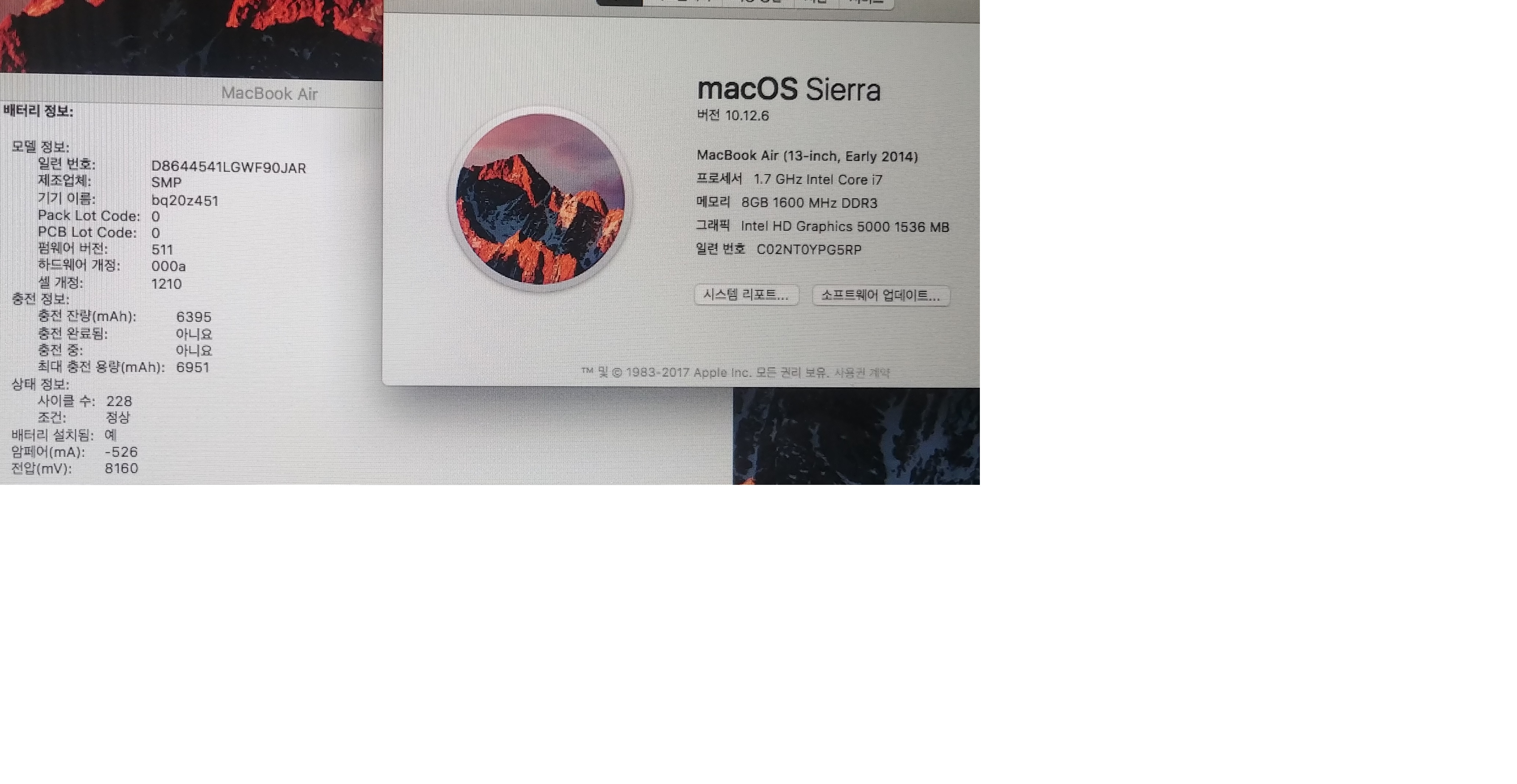 배터리 사이클 228  최대충전용량 6900